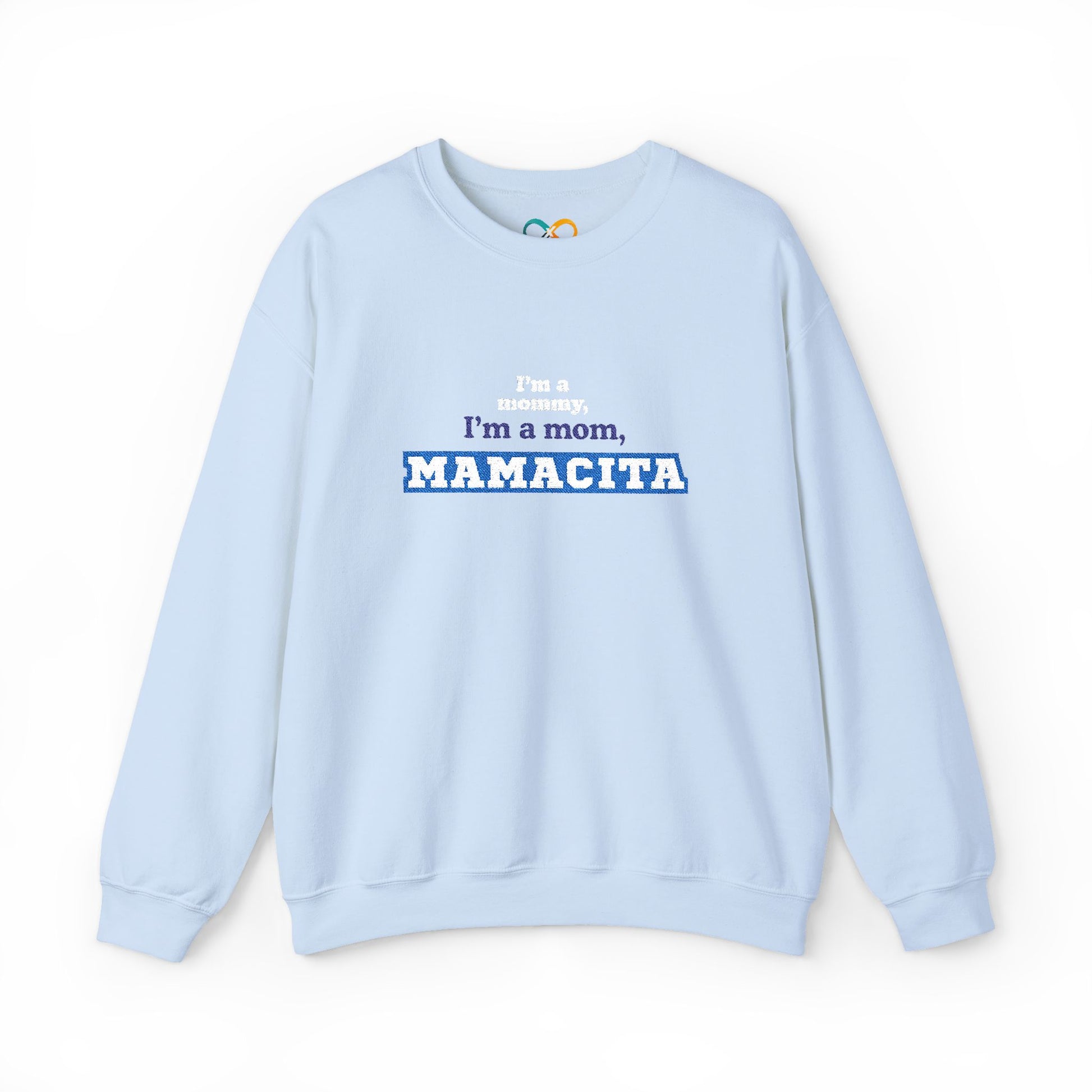 A cozy and stylish unisex heavy blend crewneck sweatshirt designed for moms, featuring the text 'I'm a mommy, I'm a mom, Mamacita'. Perfect for all moms looking for comfort and style in colder months. Ideal for new moms, baby showers, Fall, Christmas, Mother's Day, birthdays, or as a gift for the special mom in your life.