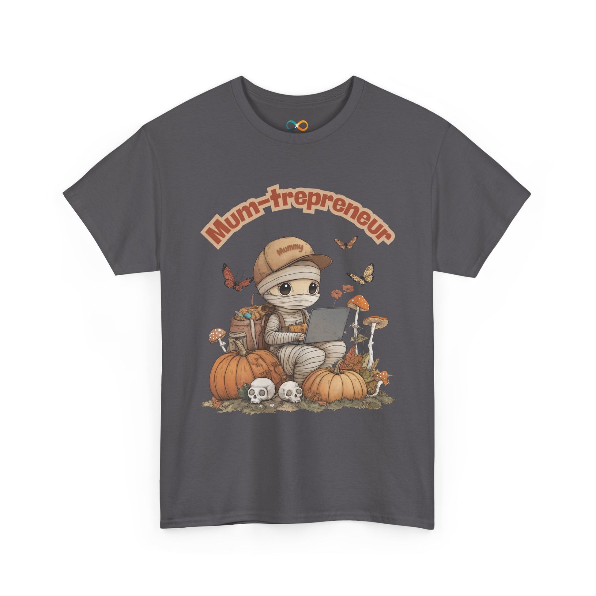 Halloween Mummy tee with Momtrepreneur Cottage core theme, perfect for all working Moms. Gives off a cozy and festive vibe, suitable for Halloween and everyday wear. Relevant to working Moms and Halloween enthusiasts.